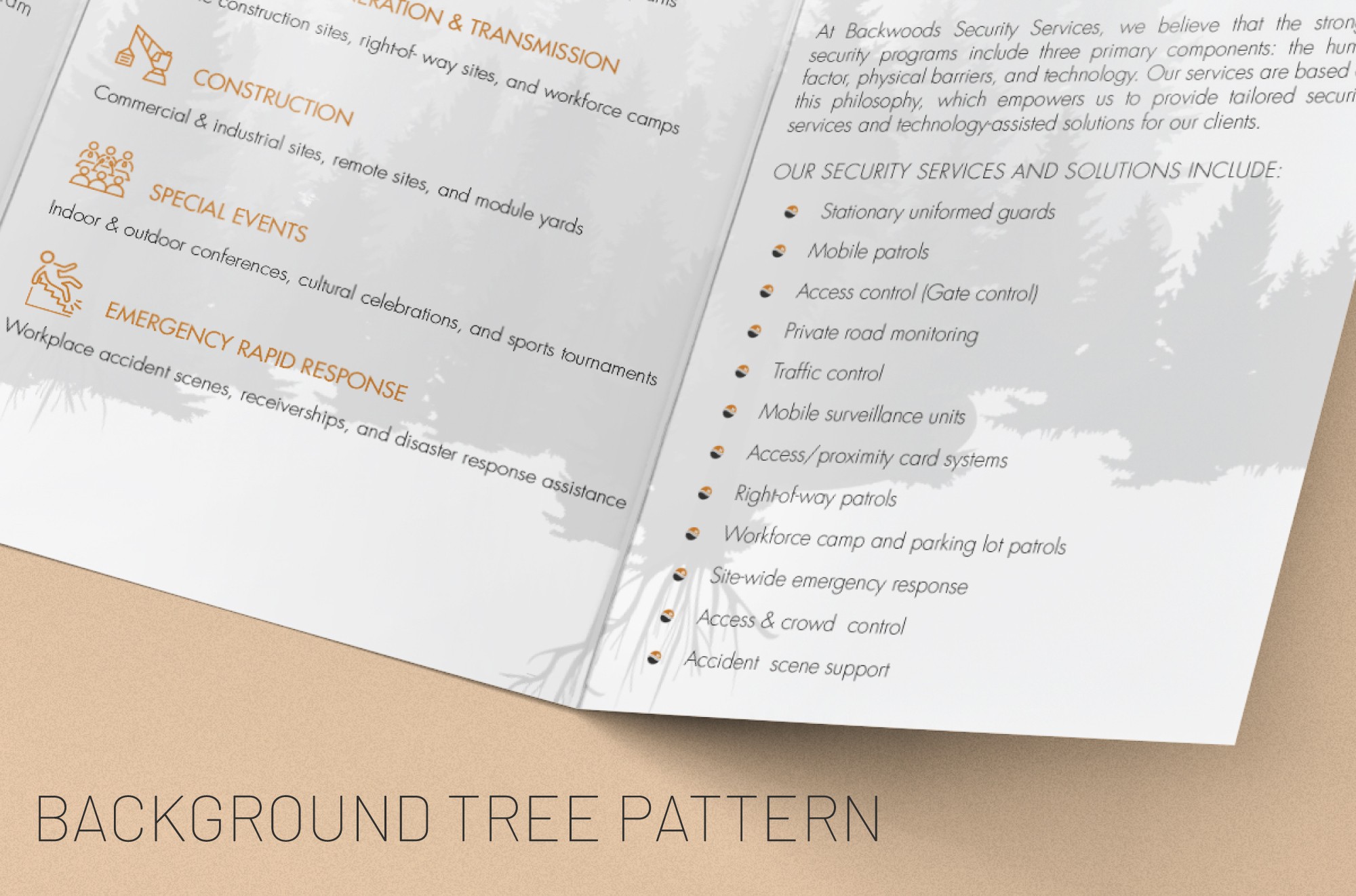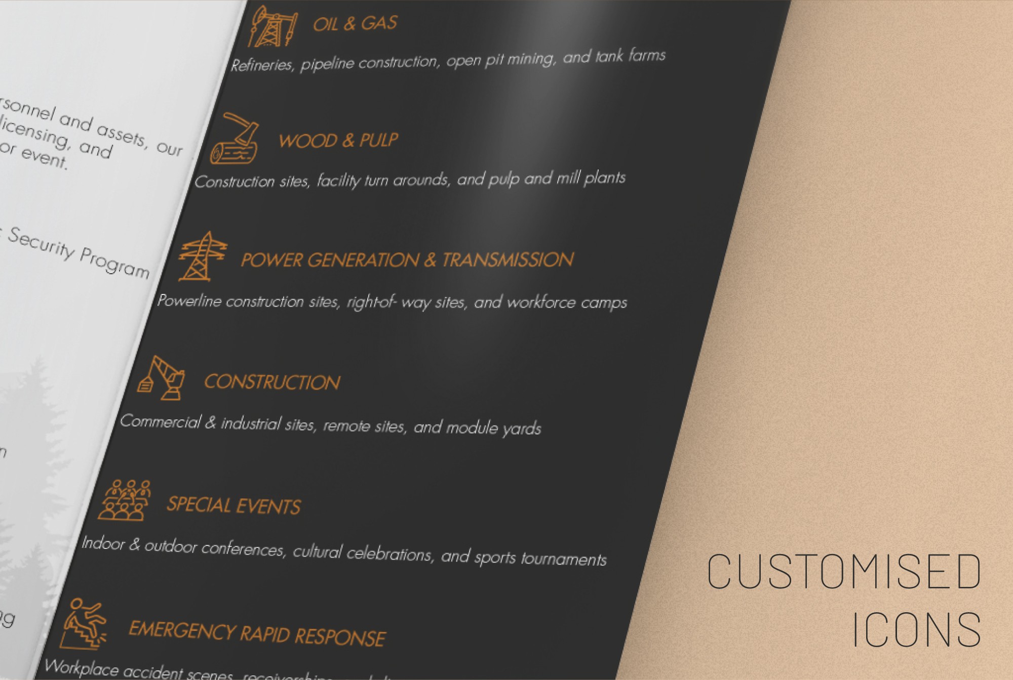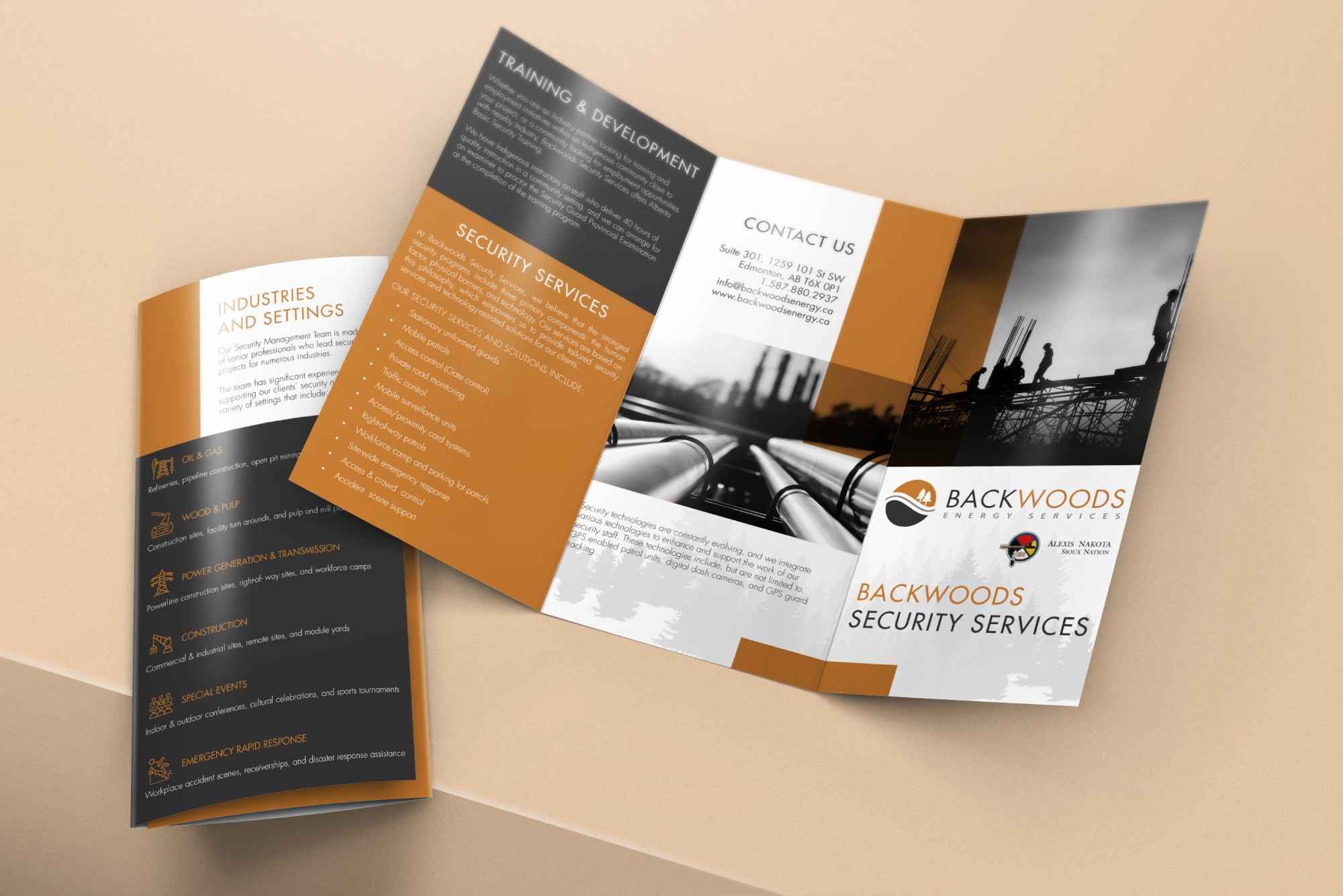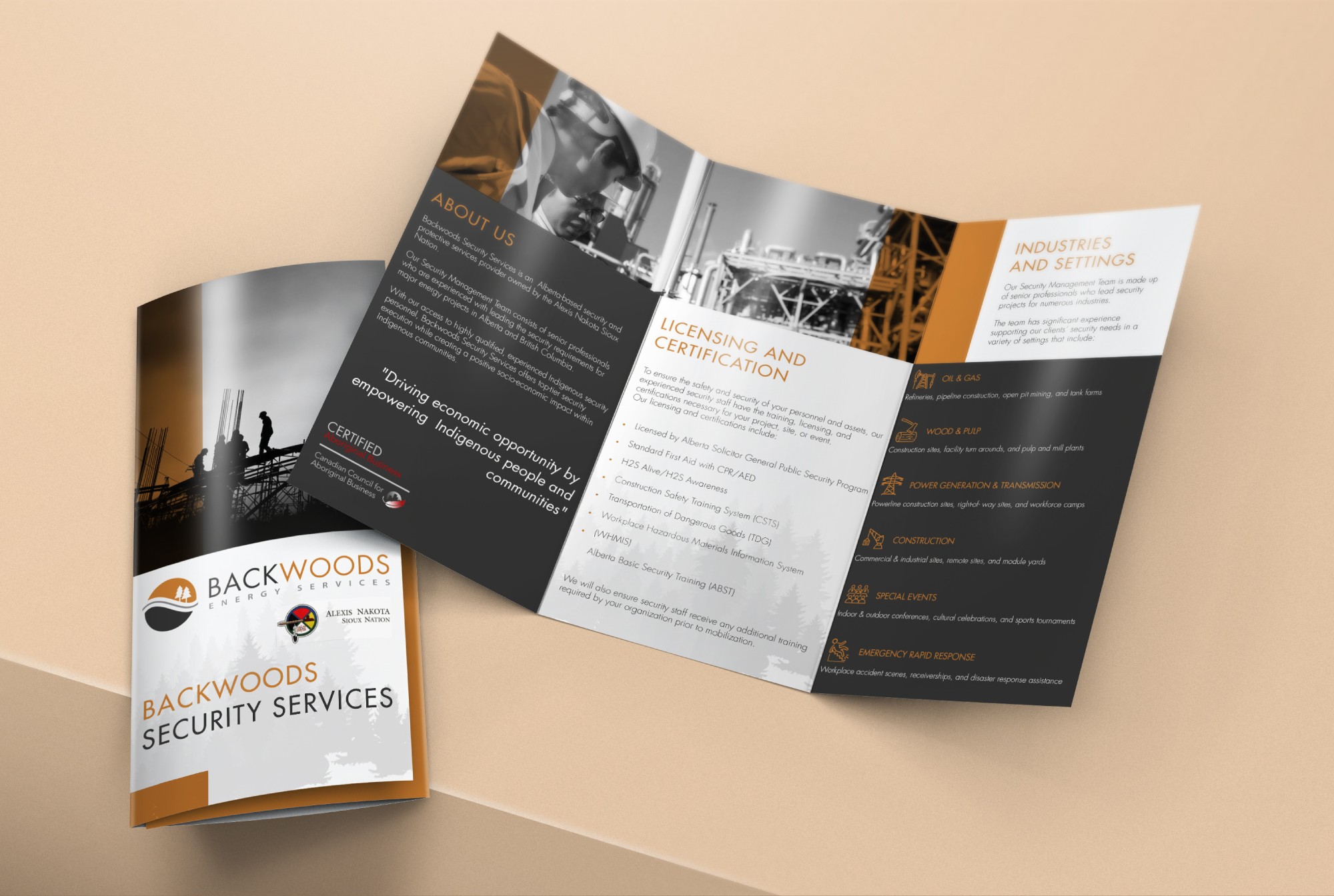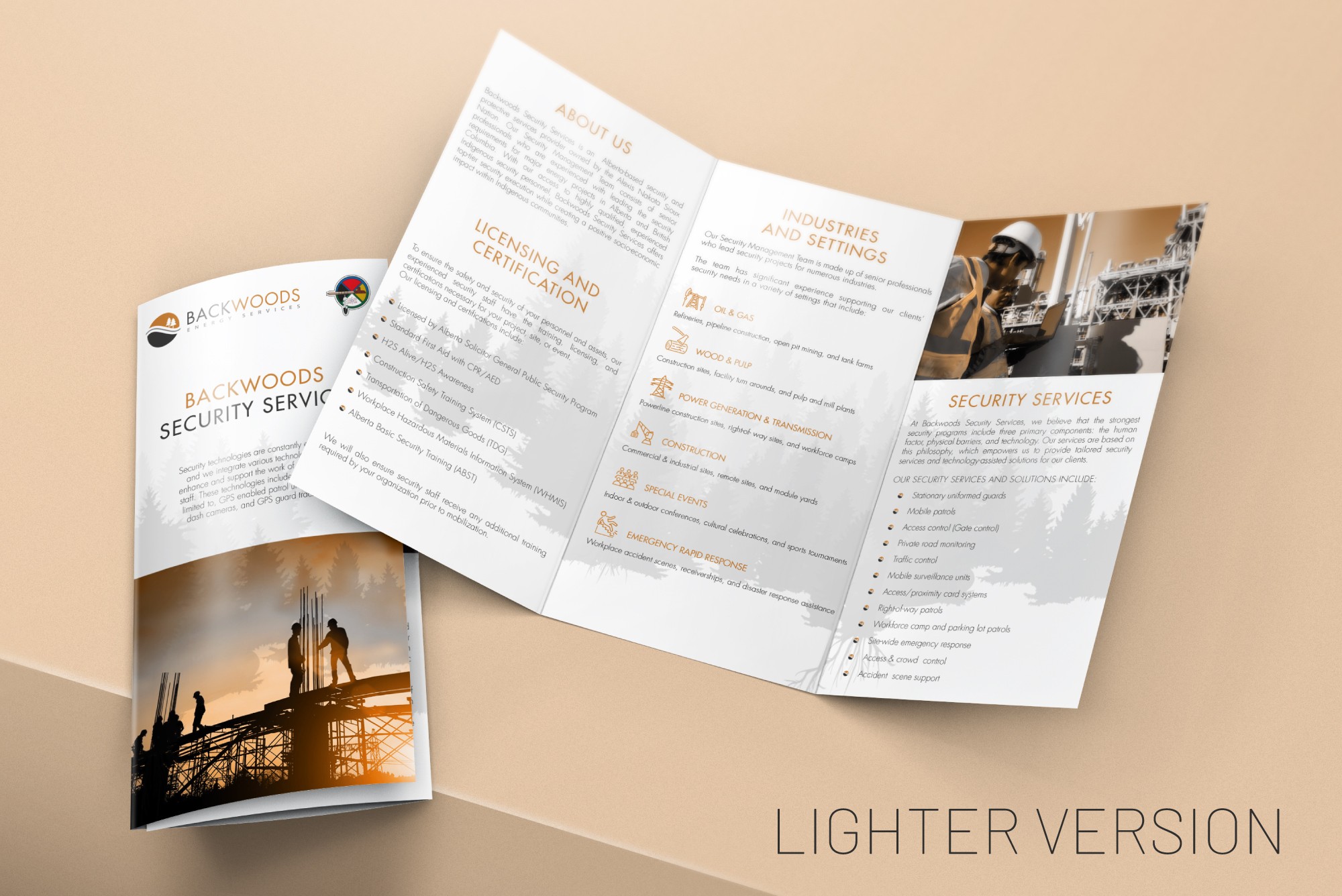 Backwoods Security operates across high-risk and large-scale industrial sectors including refineries, pipeline construction, open pit mining, tank farms and power generation facilities. Their services range from mobile patrols and CCTV monitoring to stationed guards performing compliance checks at remote camps and worksites. Given the technical and operational nature of the business, clear communication is essential. Our role was to translate complex service offerings into structured visual materials that support clarity, authority and professional presentation. The result is a cohesive set of communication tools designed to reinforce credibility and ensure information is easily understood across industrial audiences.