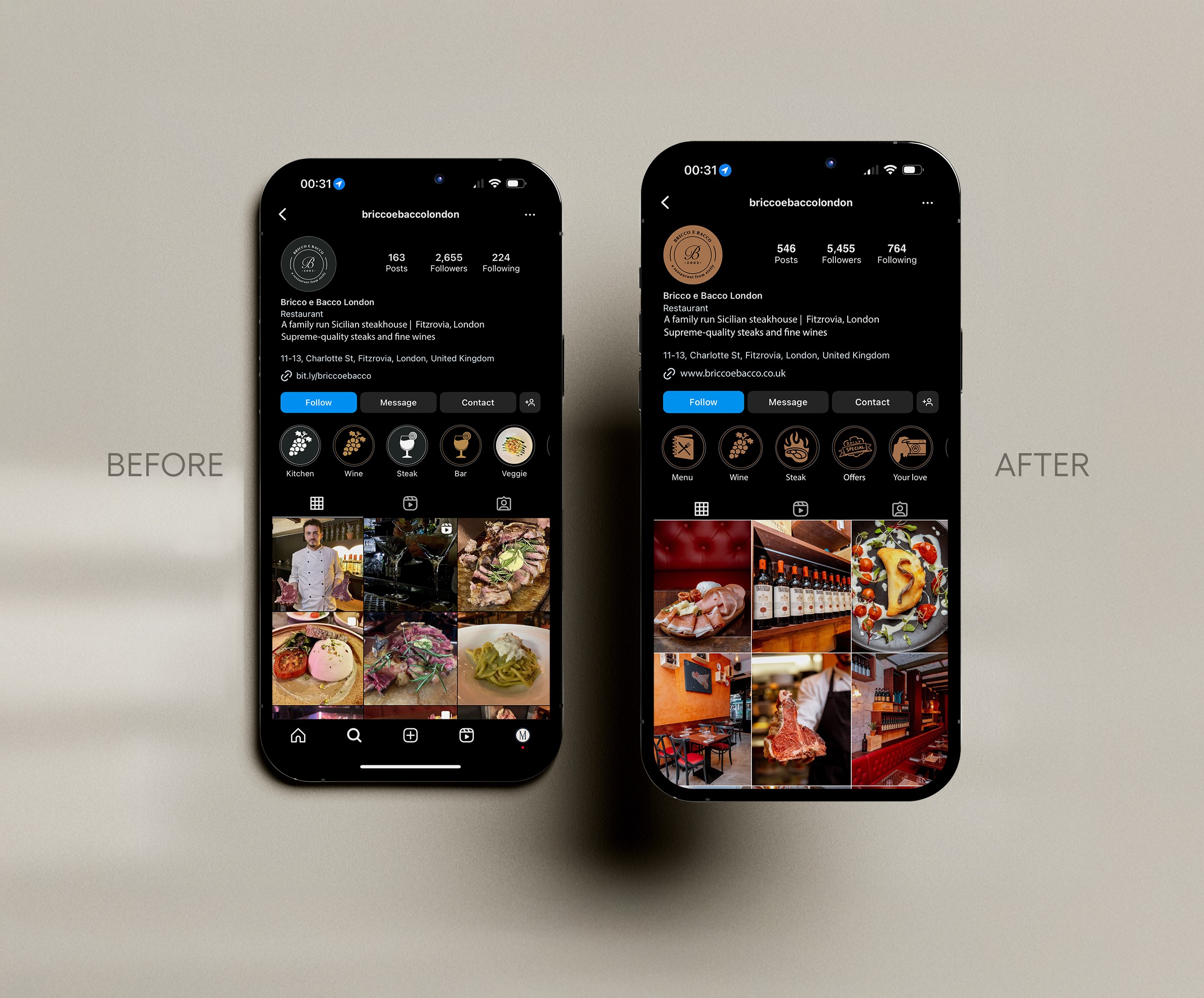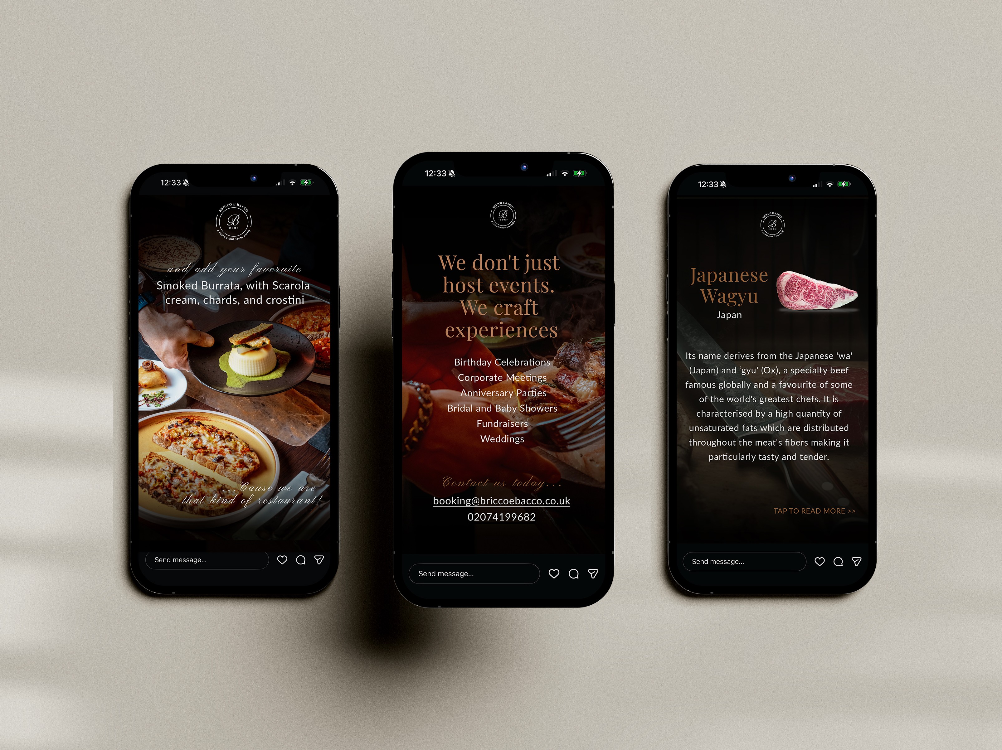 Bricco e Bacco is an Italian steakhouse rooted in tradition and quality, located in the heart of Fitzrovia. Our role was to amplify the restaurant’s presence through refined visuals, dynamic content and consistent communication across digital and physical touchpoints. From photography and video to email marketing, printed materials and PR collaboration with Jori White, we helped shape a stronger, more recognisable brand narrative that resonates with both local diners and visitors to Central London.