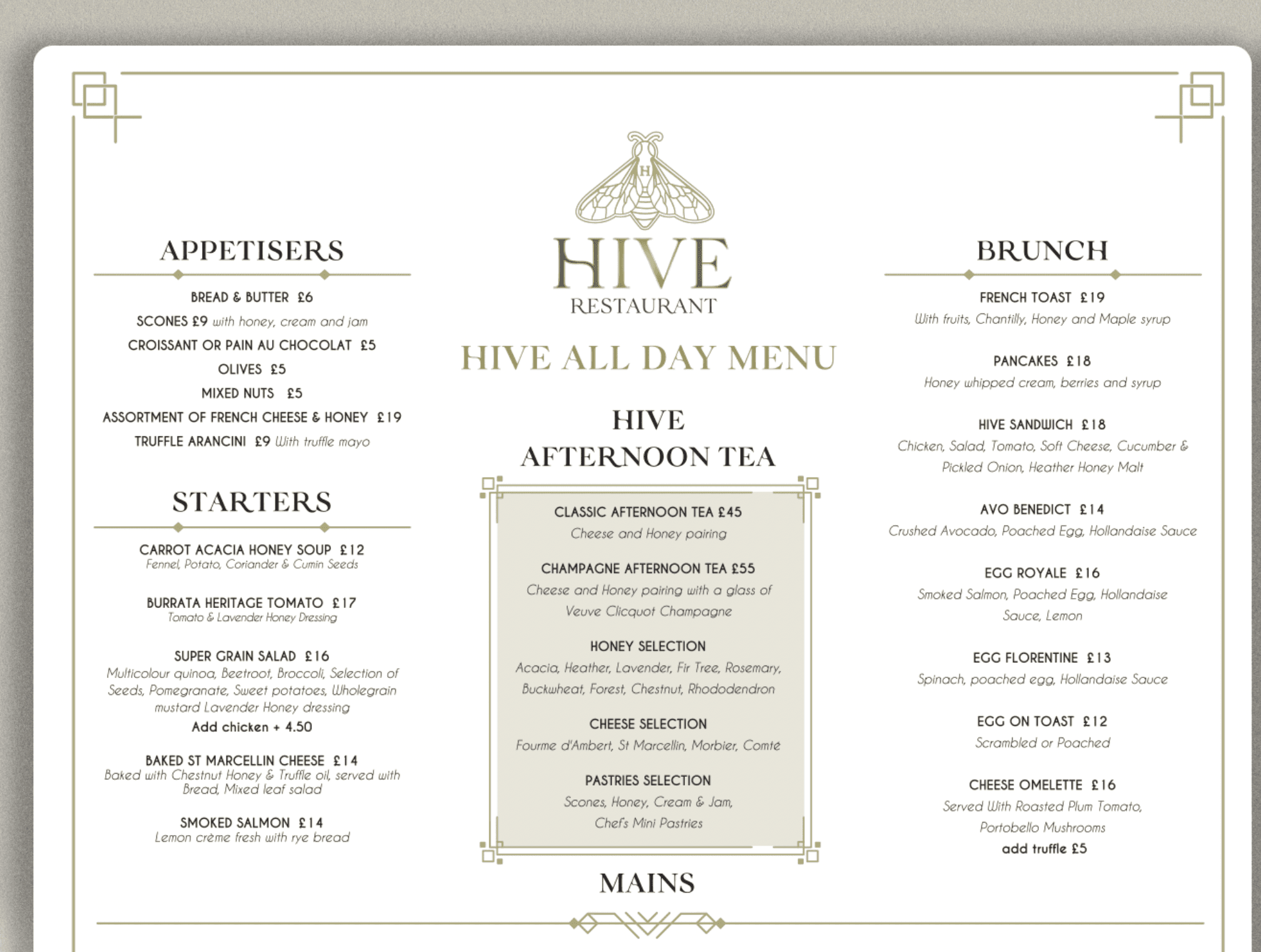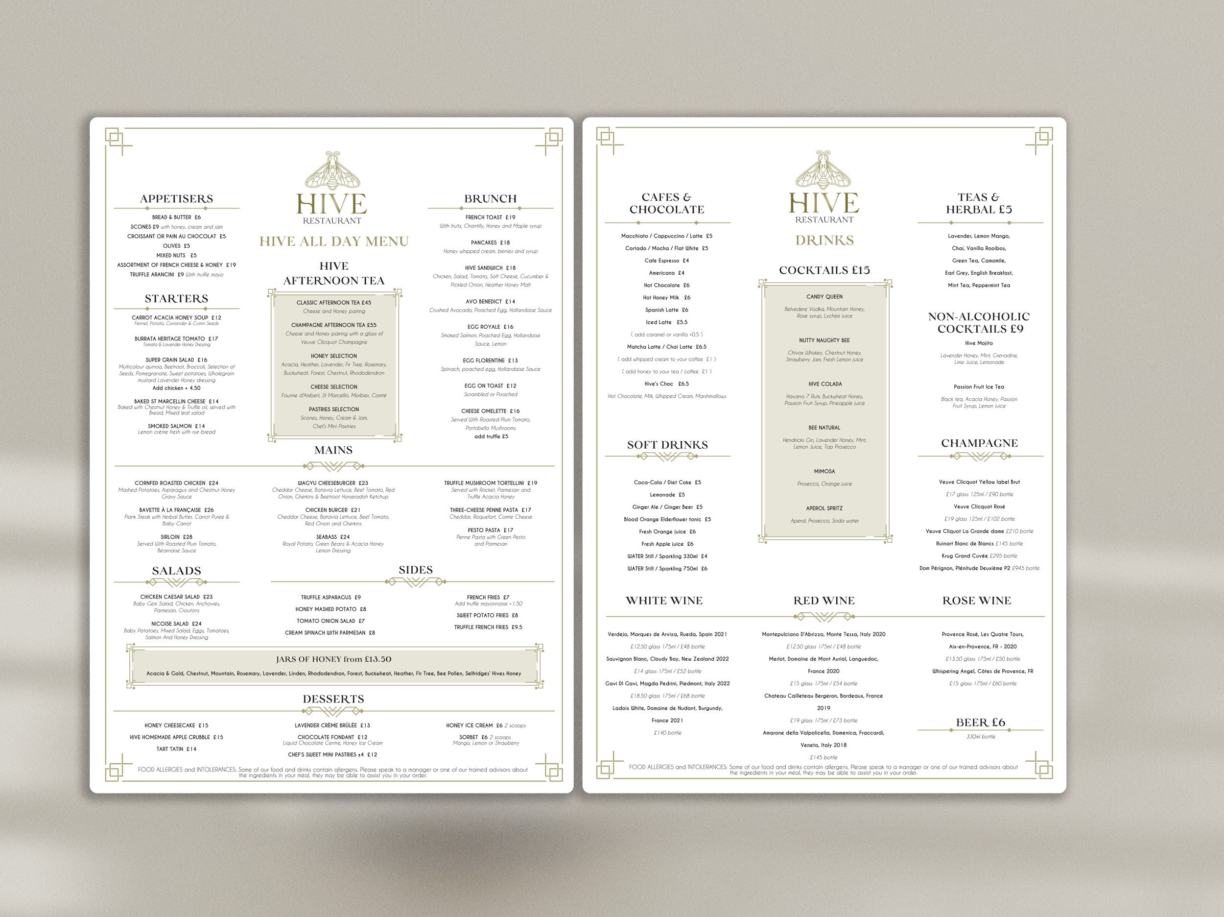 For Hive Restaurants, we redesigned the menu system to align seamlessly with the brand’s identity — introducing a more refined, recognisable and luxurious presentation rooted in the story of honey.