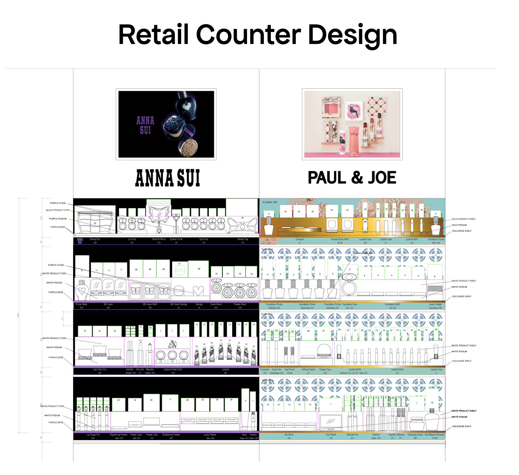 For PAUL & JOE and ANNA SUI, we crafted bespoke retail visuals that translate each brand’s aesthetic into a refined, cohesive makeup experience.